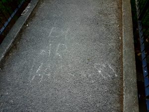 När jag senare gick ut hade hon utanför vår port gjort samma. Och även skrivit “Välkommen hem”