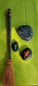 När livet ramlar över mig och det känns allt för intensivt. Drar jag mig undan och ofta tar jag kreativiteten till att lugna och trösta. Denna helg som gick i värmens och för mig värkens tecken. Spenderades på verandan. Jag pysslade med mina stenar. En häxkvast för ceremonier blev också dekorerad och iordningställd.